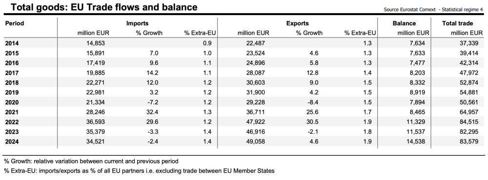 Between 2014 and 2024, the Western Balkans had a trade deficit with the EU of nearly €102 billion. In the earlier decade, the trade deficit was also approximately €100 billion.